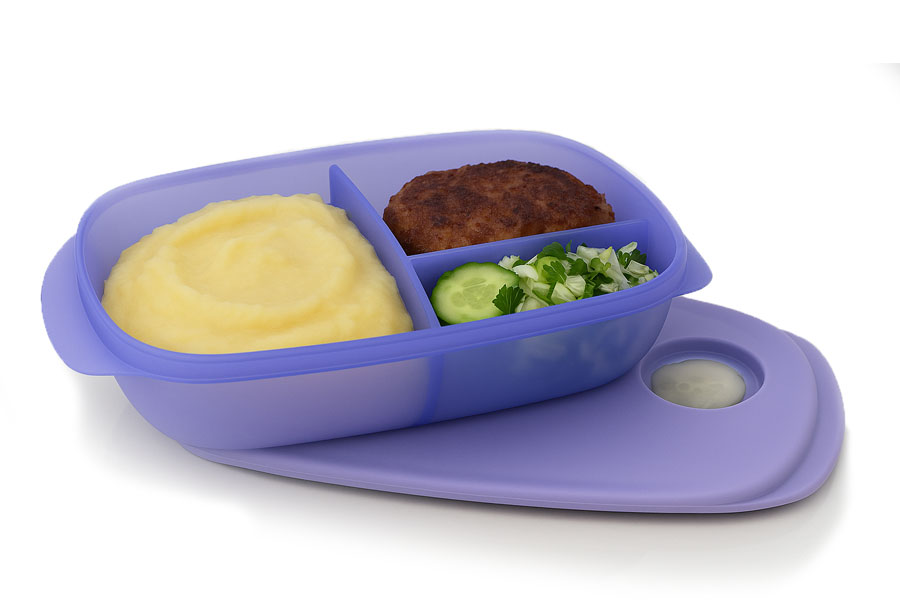Соберите на работу плотный обед в емкости с разделителем для СВЧ печи сиреневой 1л. Используйте один контейнер для транспортировки и разогрева трех разных блюд.